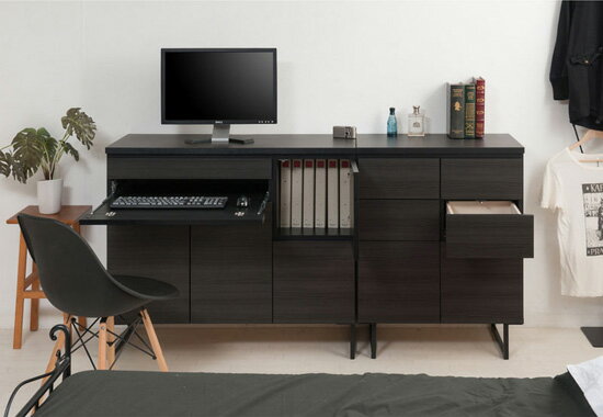 扉・引出しの構成のキャビネットやローボードに機能的なデスクタイプも加わりリビング空間をカッコよく演出。