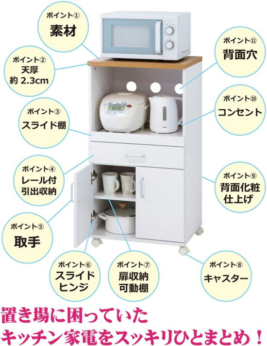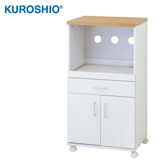 キッチンワゴン 詳細 【商品名】 クロシオ らくらくレンジワゴン ホワイト 65703 【サイズ(約)】 幅54×奥行41×高さ100.5cm 【重量(約)】 25.5kg 【仕様】 1500W2口コンセント(コード長さ約200cm)、背面コード穴(3ヶ所・直径約6cm)、扉はスライドヒンジ、キャスター4個(ストッパー付き2個)、空間内寸(約幅50.5×奥行37×高さ38cm)、スライド棚(約幅48×奥行35cm)、引出内寸(約幅45×奥行33.5×深さ6.5(8.5)cm)、扉内寸(約50×奥行37×高さ38cm、可動板1枚・3.2cmピッチ3ヶ所移動) 【メーカー】 クロシオ 【区分】 家具・お客様組立品 【生産国】 中国 【材質】 合成樹脂化粧繊維板(メラミン樹脂) 【JAN】 4954877657033 クロシオ らくらくレンジワゴンの特徴 ■ポイント1:素材 耐熱性・耐水性に優れ、キズにも強いメラミン素材を全ての面に使用しておりますので安心してご使用いただけます。
